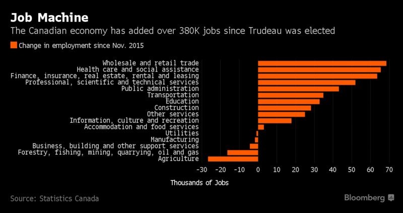 And yet it’s something Trudeau has rarely mentioned before this week, when he celebrated Canada’s addition more than 300,000 jobs over the past 12 months. Even then, he stopped short of claiming credit -- saying numbers could slip month-to-month and that his growth plan is still in its early stages.