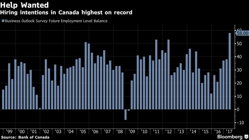 Canadian business leaders reported the strongest outlook since 2011 including record hiring plans, according to a central bank survey.
