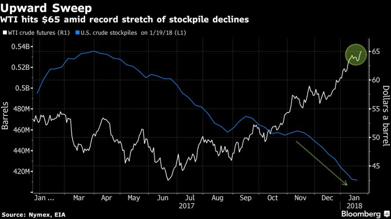 Crude popped above $65 a barrel for the first time in more than three years after U.S. crude stockpiles fell for a 10th week in the longest stretch of declines on record.