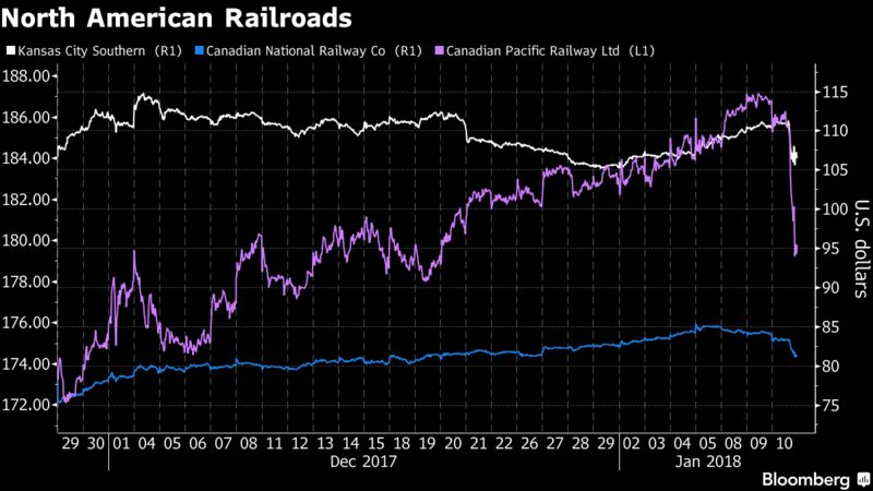 Canadian National Railway Co. fell 2.7 per cent and Canadian Pacific Railway Ltd. fell 3.1 per cent. According to estimates from BMO Nesbitt Burns, both railways derive about 30 per cent of their revenue from trade between the United States and Canada.