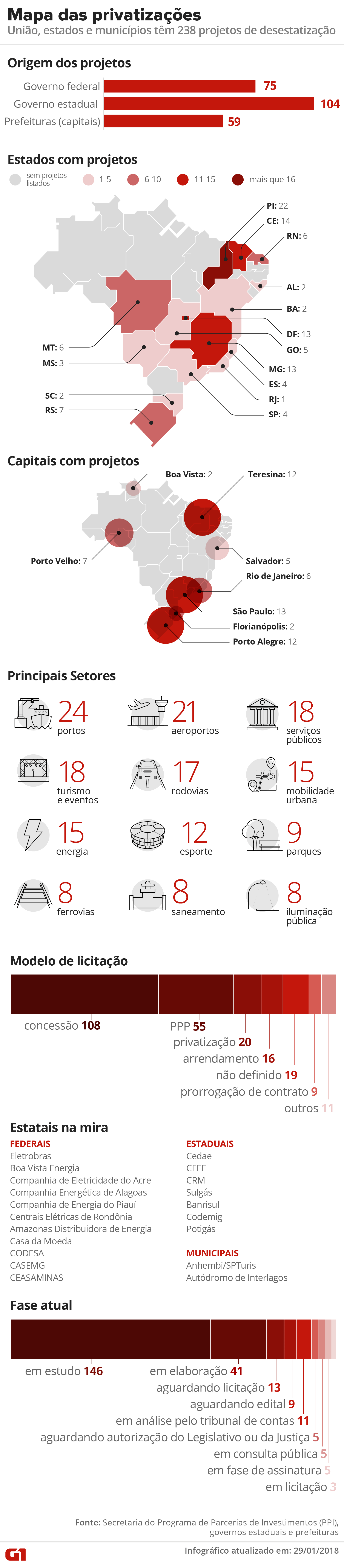 PORTAL G1. 30/01/2018. PRIVATIZAÇÕES 2018. União, estados e capitais somam mais de 230 projetos de privatização no Brasil. Levantamento do G1 lista projetos do governo federal, de 14 estados e DF, e de 8 capitais oferecidos à iniciativa privada; venda de ativos é um dos caminhos para aumentar receitas em meio à crise fiscal.