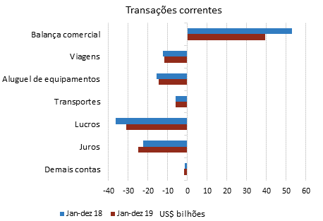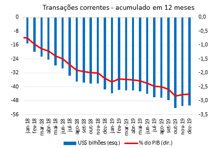 Em outubro de 2019, o déficit em transações correntes totalizou US$7,9 bilhões, ante déficit de US$2,0 bilhões em outubro de 2018 (valor revisado). O incremento no déficit decorreu, fundamentalmente, da redução no saldo positivo da balança comercial de bens, de US$5,3 bilhões para US$490 milhões. O déficit em transações correntes somou US$54,8 bilhões (3,00% do PIB) nos 12 meses encerrados em outubro, ante déficit de US$48,9 bilhões (2,67% do PIB) no período equivalente, até setembro (valor revisado). A seção 3 apresenta os detalhes da revisão de lucros de investimento direto.