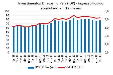 Os ingressos líquidos em investimentos diretos no país (IDP) somaram US$6,8 bilhões no mês, resultado de ingressos líquidos de US$5,3 bilhões em participação no capital e ingressos líquidos de US$1,5 bilhão em operações intercompanhia. No acumulado do ano, os ingressos líquidos de IDP somaram US$62,1 bilhões, superiores aos US$60,8 bilhões observados no mesmo período de 2018 (valor revisado). No acumulado em 12 meses até outubro, os ingressos líquidos de IDP totalizaram US$79,5 bilhões, equivalentes a 4,35% do PIB (US$81,1 bilhão e 4,43% do PIB no acumulado em 12 meses até setembro).