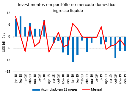 Em outubro, houve saídas líquidas de US$4,0 bilhões em instrumentos de portfólio negociados no mercado doméstico, dos quais US$1,2 bilhão em ações e fundos de investimento e US$2,8 bilhões em títulos de dívida. No ano, até outubro, as saídas líquidas de US$1,4 bilhão em instrumentos negociados no mercado doméstico, compostas por saídas líquidas de US$3,3 bilhões em ações e fundos de investimento, e entradas líquidas de US$1,8 bilhão em títulos de dívida.