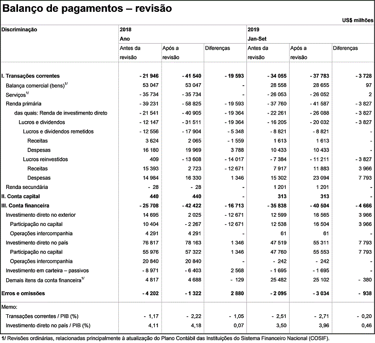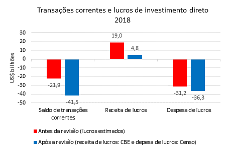 A revisão dos lucros líquidos totais para o ano de 2018 impacta as transações correntes, os investimentos diretos no exterior (IDE) e os investimentos diretos no país (IDP).