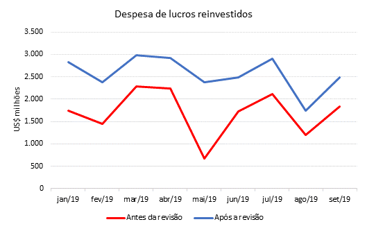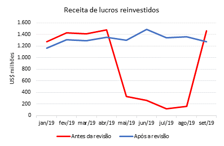 Para o período de janeiro a setembro de 2019, as estimativas preliminares de lucros de investimento direto também foram revisadas. As receitas de lucros foram revisadas a partir das informações para o primeiro semestre de 2019 constantes dos CBE trimestrais para o primeiro e segundo trimestres do ano (extrapolados). As despesas de lucros, igualmente, foram revisadas a partir das informações para o primeiro semestre de 2019 constantes dos balanços contábeis das empresas abertas (aproximadamente 30% do estoque dos passivos de investimentos diretos) e da Declaração Econômico-Financeira trimestral, integrante do Registro Declaratório Eletrônico de Investimentos Estrangeiros Diretos (RDE-IED). Também foram utilizadas informações dos contratos de câmbio, tanto para receitas quanto para despesas.