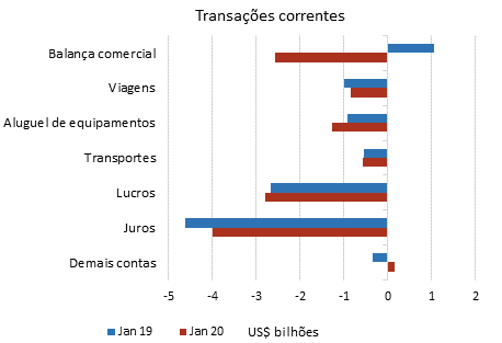 Em janeiro de 2020, o déficit em transações correntes totalizou US$11,9 bilhões, ante déficit de US$9,0 bilhões no mesmo mês de 2019. A elevação no déficit decorreu da retração de US$3,6 bilhões no saldo da balança comercial, parcialmente compensada pelas reduções de US$506 milhões e de US$182 milhões nas despesas líquidas de renda primária e de serviços, respectivamente, e pelo aumento das receitas líquidas de renda secundária, US$96 milhões. O déficit em transações correntes nos doze meses encerrados em janeiro de 2020 somou US$52,3 bilhões (2,85% do PIB), ante US$49,5 bilhões (2,69% do PIB), em 2019.