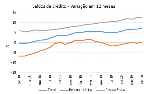 O saldo das operações de crédito do sistema financeiro nacional (SFN) totalizou R$3,5 trilhões em janeiro, queda de 0,4% no mês, com redução de 2,2% na carteira de pessoas jurídicas (saldo de R$1,4 trilhão), influenciada pela sazonalidade, e aumento de 0,8% em pessoas físicas (R$2 trilhões). O crescimento em doze meses do estoque de crédito do SFN alcançou 7%, resultado das expansões de 12,2% no crédito às famílias e de 0,4% no crédito às empresas.