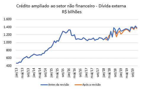 Como resultado da revisão, em dezembro de 2019, o total da dívida externa do setor privado não financeiro (Tabela 32-B) passou de R$1.384 bilhões (estatística divulgada em janeiro) para R$1.359 bilhões (estatística revisada). A revisão ocorreu em duas séries componentes: Empréstimos (de R$1.271 bilhões para R$1.270 bilhões) e Títulos emitidos no mercado externo (de R$104 bilhões para R$81 bilhões).