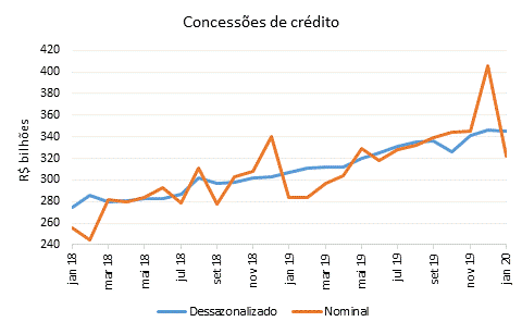 As concessões totais de crédito do SFN somaram R$322 bilhões em janeiro, declínio de 19% no mês, influenciada por fatores sazonais. A estatística de concessões de crédito ajustada sazonalmente apresentou redução de 0,3%, com quedas de 0,1% em pessoas físicas e jurídicas. Na comparação com janeiro de 2019, as concessões cresceram 13,6% (15,5% no crédito às famílias e 10,8% com empresas).