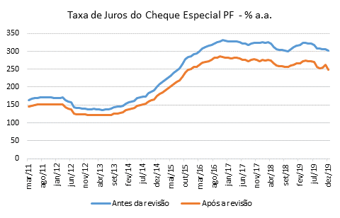 Como resultado da revisão, a taxa média de juros das concessões do cheque especial a pessoas físicas, em dezembro de 2019, passou de 302,5% a.a. (estatística divulgada em janeiro) para 247,6% (estatística revisada). Nas concessões a pessoas jurídicas a taxa reduziu-se de 331,5% a.a. (estatística divulgada em janeiro) para 310,9% (estatística revisada).