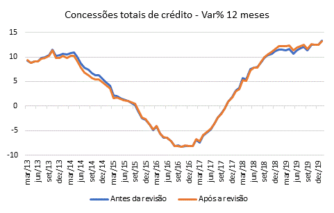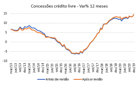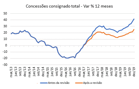 Como resultado da revisão, as concessões de crédito consignado total, em dezembro de 2019, passaram de R$24,6 bilhões (estatística divulgada em janeiro) para R$19,1 bilhões (estatística revisada) e a taxa de variação do acumulado em doze meses, de 41,4% (estatística divulgada em janeiro) para 25,1% (estatística revisada).