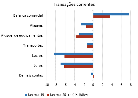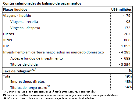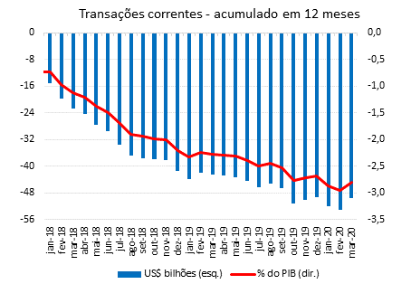 Para o mês de abril, a estimativa para o resultado em transações correntes é de superávit de US$2,0 bilhões, enquanto a de IDP é de ingressos líquidos de US$1,5 bilhão.