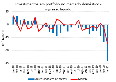 A PII líquida devedora de março de 2020 foi estimada em US$348,4 bilhões (19,7% do PIB). Comparativamente à estimativa para fevereiro de 2020, US$567,8 bilhões (31,6% do PIB), a posição tornou-se menos devedora em US$219,4 bilhões, concentrados na redução do estoque de passivos. Apesar das saídas líquidas de investidores não residentes em instrumentos de portfólio negociados no país, o recuo das posições de passivos na comparação entre março e fevereiro decorreu, em maioria, de variações por preço e paridade. A depreciação da moeda doméstica reduziu o estoque de passivos externos denominados em moeda nacional, tais como IDP – Participação no capital e títulos e ações negociados no mercado interno, com efeito total estimado em US$104 bilhões. A variação de preço para passivos em ações, empresas de IDP, e títulos soberanos no mercado internacional, foi estimada em US$106 bilhões.