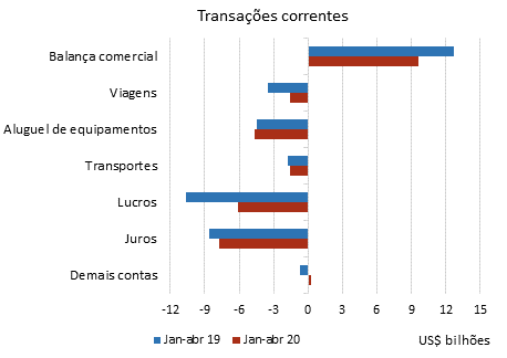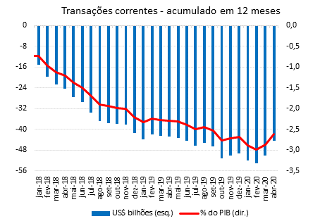 Em abril de 2020, as transações correntes apresentaram superávit pelo segundo mês consecutivo, US$3,8 bilhões, maior valor da série histórica mensal iniciada em janeiro de 1995. Na comparação com o déficit de US$1,9 bilhão ocorrido em abril de 2019, contribuíram, principalmente, os recuos no déficit em renda primária, US$2,3 bilhões, e em serviços, US$2,1 bilhões, além da elevação do superávit da balança comercial, US$1,3 bilhão. O déficit em transações correntes do primeiro quadrimestre de 2020 somou US$11,9 bilhões, recuo de 29,9% em relação aos US$17,0 bilhões registrados em período correspondente de 2019. O déficit em transações correntes nos doze meses encerrados em abril de 2020 somou US$44,4 bilhões (2,61% do PIB), ante US$50,1 bilhões (2,87% do PIB), em março de 2020.