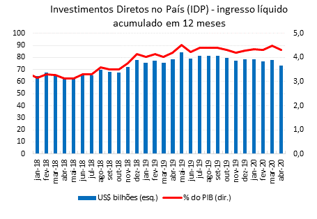 Os ingressos líquidos em investimentos diretos no país (IDP) somaram US$234 milhões no mês, ante US$5,1 bilhões em abril de 2019. O fluxo foi composto por ingressos líquidos de US$320 milhões em participação no capital e por amortizações líquidas de US$86 milhões em operações intercompanhia. O resultado em participação no capital foi influenciado por lucros reinvestidos negativos (desinvestimentos) de US$834 milhões. Nos doze meses encerrados em março de 2020, o IDP totalizou US$73,2 bilhões, correspondendo a 4,31% do PIB, em comparação a US$78,1 bilhões (4,48% do PIB) no mês anterior.