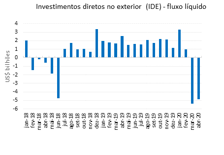 Em abril de 2020, os fluxos líquidos de investimentos diretos no exterior (IDE) apresentaram – a exemplo do observado no mês anterior – regressos líquidos ao país (desinvestimentos), que totalizaram US$4,8 bilhões, ante aplicações líquidas de US$2,6 bilhões no exterior, no mês equivalente de 2019.