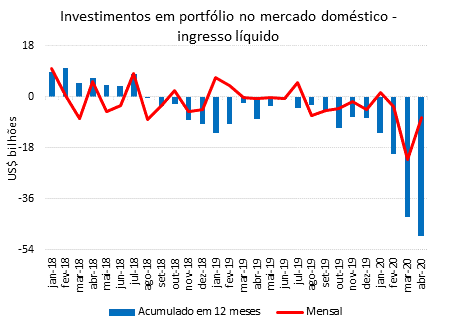 No mês, a saída líquida de investimento em portfólio no mercado doméstico somou US$7,3 bilhões, com saídas líquidas de US$4,9 bilhões em títulos de dívida e de US$2,4 bilhões em ações e fundos de investimento. No primeiro quadrimestre de 2020 houve saídas líquidas de US$31,4 bilhões em instrumentos de portfólio negociados no mercado doméstico, comparativamente a ingressos líquidos de US$10,0 bilhões observados em período similar do ano anterior. Nos doze meses encerrados em abril de 2020, a saída líquida de investimento em portfólio no mercado doméstico somou US$49,0 bilhões.