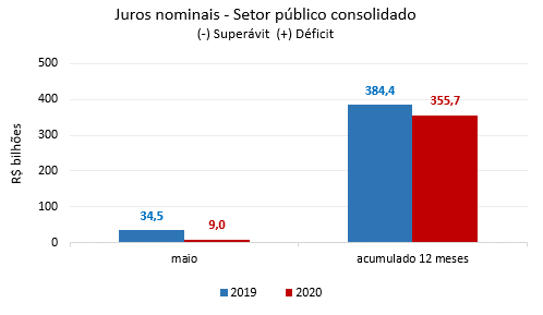 Os juros nominais do setor público consolidado, apropriados por competência, somaram R$9 bilhões em maio, comparativamente a R$34,5 bilhões no mesmo mês de 2019. Contribuíram para essa evolução as reduções na taxa Selic e no IPCA no período, além da trajetória favorável das operações de swap cambial (ganho de R$3,5 bilhões, em maio de 2020, ante perda de R$1,6 bilhão, no mesmo mês de 2019). Nos últimos doze meses, os juros nominais atingiram R$355,7 bilhões (4,91% do PIB), comparativamente a R$384,4 bilhões (5,46% do PIB) no acumulado até maio do ano anterior.