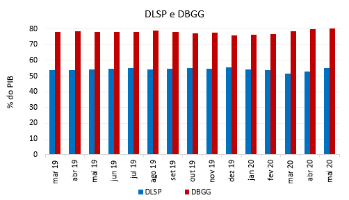 A DBGG – que compreende o Governo Federal, o INSS e os governos estaduais e municipais – alcançou R$5.929,1 bilhões em maio, equivalente a 81,9% do PIB, aumento de 2,1 p.p. do PIB em relação ao mês anterior. Essa evolução decorreu de emissões líquidas de dívida bruta (aumento de 1,3 p.p.), do efeito da variação do PIB nominal (aumento de 0,5 p.p.) e da incorporação de juros nominais (aumento de 0,3 p.p.). No ano, o aumento de 6,1 p.p. na relação DBGG/PIB decorreu das emissões líquidas de dívida (aumento de 2,5 p.p.), da incorporação de juros nominais (aumento de 1,9 p.p.), da desvalorização cambial acumulada (aumento de 1,6 p.p.), do efeito da variação do PIB nominal (aumento de 0,2 p.p.) e do ajuste da paridade da cesta de moedas da dívida externa (redução de 0,1 p.p.).