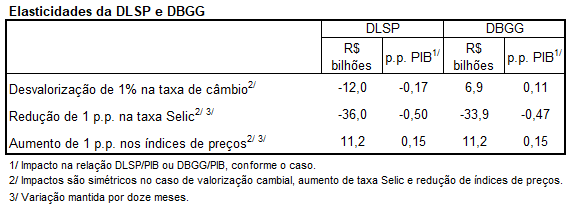 A tabela a seguir atualiza as elasticidades da DLSP e da DBGG a variações na taxa de câmbio, na taxa de juros e nos índices de preços para o mês de maio.